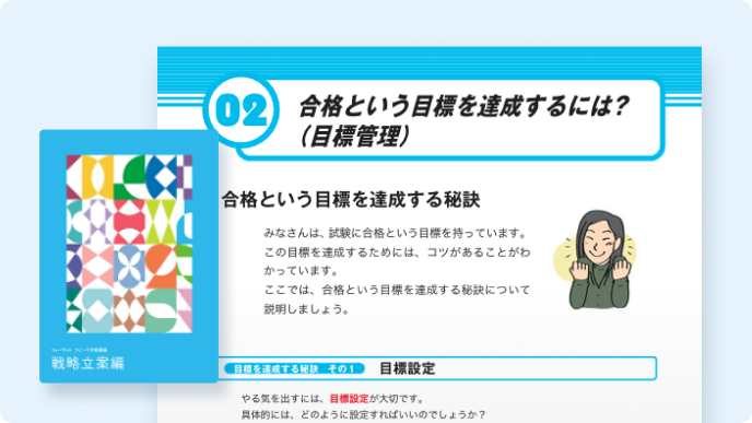 まずは「受講ガイド」で講座全体の流れを把握します。その次に「戦略立案編」で合格するための目標設定の秘訣を学び、学習プランを立てます。