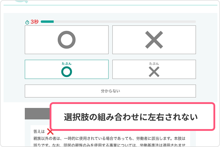 フォーサイトの5段階回答方式では「〇」・「たぶん〇」・「✖」️「たぶんば✖」・「わからない5段階」の回答であやふやな部分をなくすことができます。「なんとなく正解」していた選択肢を「自信をもって正解」できるようになります。