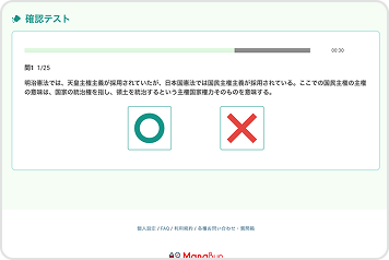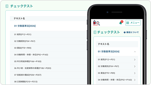 テキストの各章の学習が終わったタイミングで取り組む、〇×のテストがあります。学んだ内容がどのように出題されるかを体感することで、知識の定着に役立ちます。