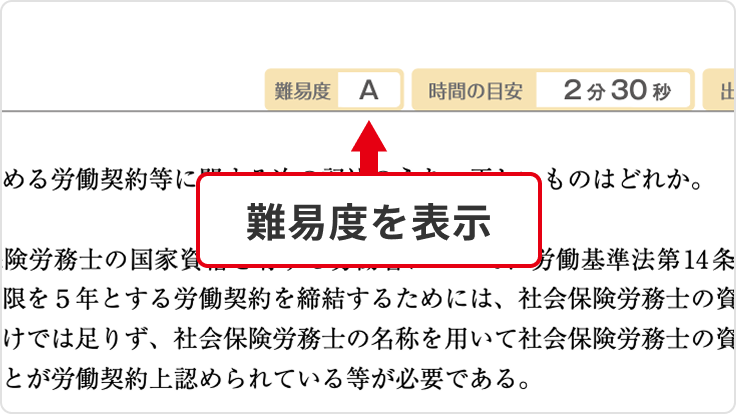 問題にはすべて、「難易度」を表示。「必ず得点しなければならない問題」を重点的に学習でき、得点力がアップします。